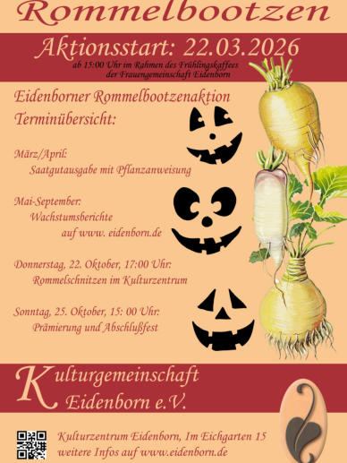 Auch 2026 wird die Aktion fortgeführt!Start: 22. März 2026, ab 15:00 Uhr beim„Frühlingskaffee der Frauengemeinachaft Eidenborn” Abschlussveranstaltung mit Prämierung der Rommelbootzen: Sonntag, 25. Oktober ab 15:00 Uhr im Rahmen des „Herbstkaffee der Frauengemeinschaft“.Die Kulturgemeinschaft Eidenborn lässt eine alte Tradition wieder aufleben: Ein Rommelbootzenfest!Ein Rommelbootz, „watt ess datt dann“?Rommeln, im hochdeutsch Rüben, wurden früher in unserer Region als Futterrüben angepflanzt, im Herbst geerntet, gehäckselt („met der Rommelratz“) und mit Schrot und Spreu vermengt den Kühen als Kraftfutter verfüttert. Heute wird industriell hergestelltes Kraftfutter verwendet, was zur Folge hatte, dass auf den Feldern der Bauern keine Rüben mehr angebaut werden. Das im Frühjahr ausgebrachte Saatgut wurde zunächst als Jungpflanze in die Felder verpflanzt und dann im Spätherbst geerntet. Die Kinder, die natürlich bei der Ernte halfen oder helfen mussten, durften sich danach die größten aussuchen. Im Wurzelbereich wurde ein Stück abgeschnitten, damit sie einen festen Stand hatten. Ebenso wurde oben die Haube etwa 5cm abgeschnitten. Die Rommel wurde danach mit einem Messer oder einem Löffel ausgehöhlt bis nur noch eine etwa 1 bis 2 cm dicke Außenwand stehen blieb. Anschließend wurden Augen, Mund und Nase ausgeschnitten, eine Kerze hineingestellt und fertig war die Rommelbootz. Am Abend, wenn es dunkel wurde, stellte man sie gut sichtbar nach draußen, zündete die Kerze an und die Rommelbootz leuchtete.Diesen Brauch wollen wir wiederbeleben: Da aber, wie schon vorher erwähnt, keine Rüben mehr in unserer Region angebaut werden, tun wir dies einfach selbst. Und hier sind vor allem die Kinder angesprochen, die in einer Art Wettbewerb die Rüben selbst sähen, verpflanzen, pflegen und im Herbst auch ernten sollen. Dies kann im eigenem Garten, in größeren Töpfen erfolgen. Jeder kann seine eigene Rüben pflanzen, pflegen und später ernten.Im Oktober werden dann die schönsten Rommelbozen bei einer Veranstaltung im Kulturzentrum vorgestellt und prämiert.Den Rübensamen stellt die Kulturgemeinschaft Eidenborn zur Verfügung. Dieser kann beim Aktionsstart ab 15 Uhr im Kulturzentrum mit detaillierter Pflanzanweisung beim Frühlingskaffee der Frauengemeinschaft abgeholt werden. Weitere Ausgabetermine jeweils donnerstags von 17:00 bis 19:30 Uhr im Kulturzentrum Eidenborn.Über eine rege Teilnahme würden wir uns sehr freuen. Aktuelle Informationen immer unter www.eidenborn.de.Die Kulturgemeinschaft Eidenborn