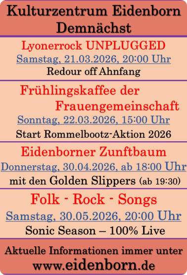 Die Kulturgemeinschaft Eidenborn e.V. wurde 2008 gegründet mit dem Ziel, kulturelle Veranstaltungen in Eidenborn anzubieten. Durch die Nutzung der ehemaligen